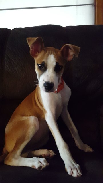 Adopted around 2 weeks ago. She is 5 months old, 15 inches tall at shoulders, around 20 lbs. She's active and loves to play with our other dog, he's a beagle mix. She's also a cuddler, she loves to curl up on our laps and watch TV. She also loves to give kisses and doesn't bark too much unless she sees a little animal outside or hears someone coming into our house. She has a little wiggle butt, but her tail is a little longer and does curl up. She's a sweetheart and has caught on quickly.