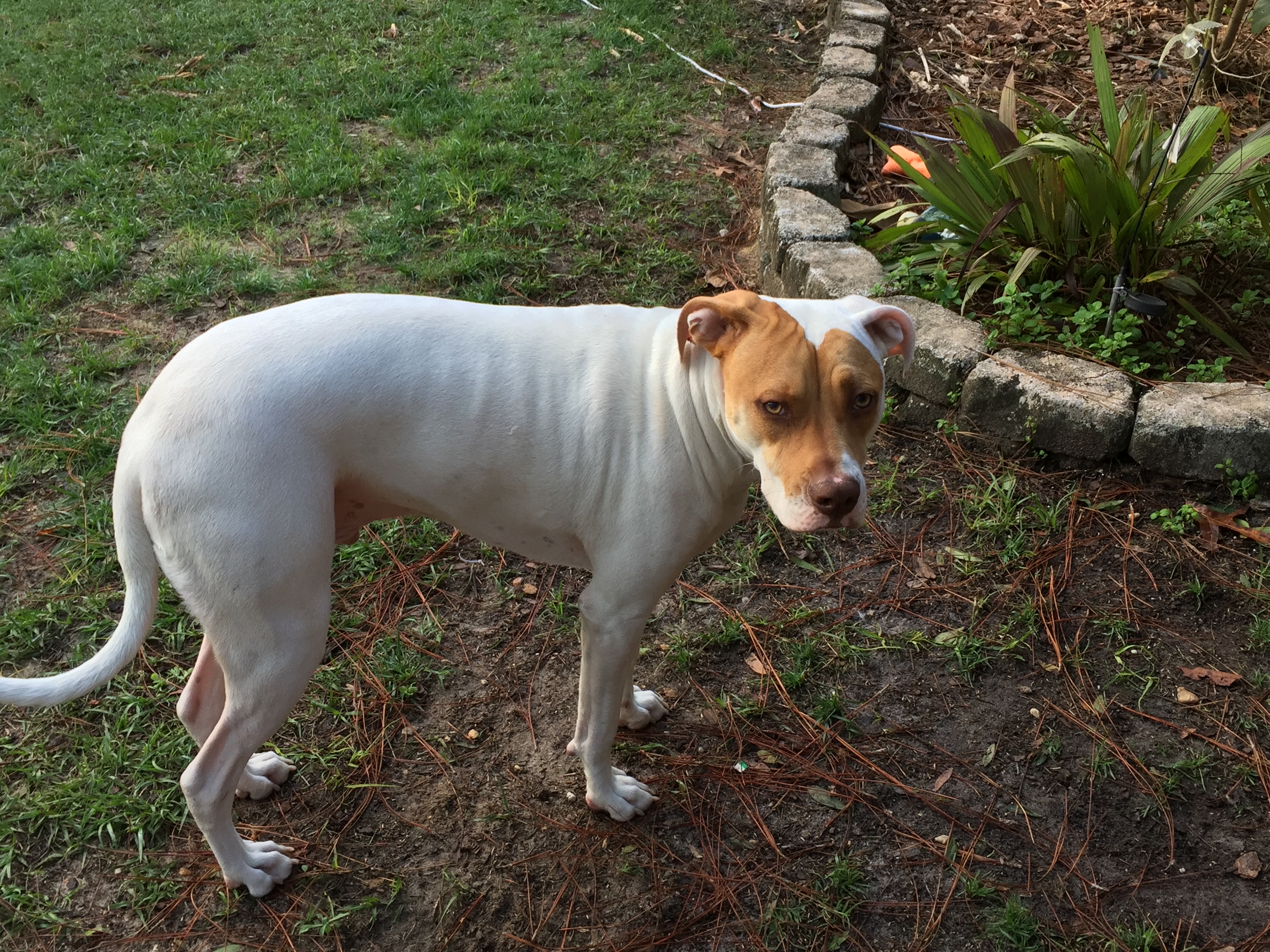 Gunner was adopted from the humane society, being i am in horse hunting dog area, I'm assuming he has a type of hunting hound in him, He is 26" tall and 73 lbs. His smiley type face and wide jaws tells me he has pit bull breed in him also. He has a shy temperament and a pack mentality. he loves being in a group of dogs.