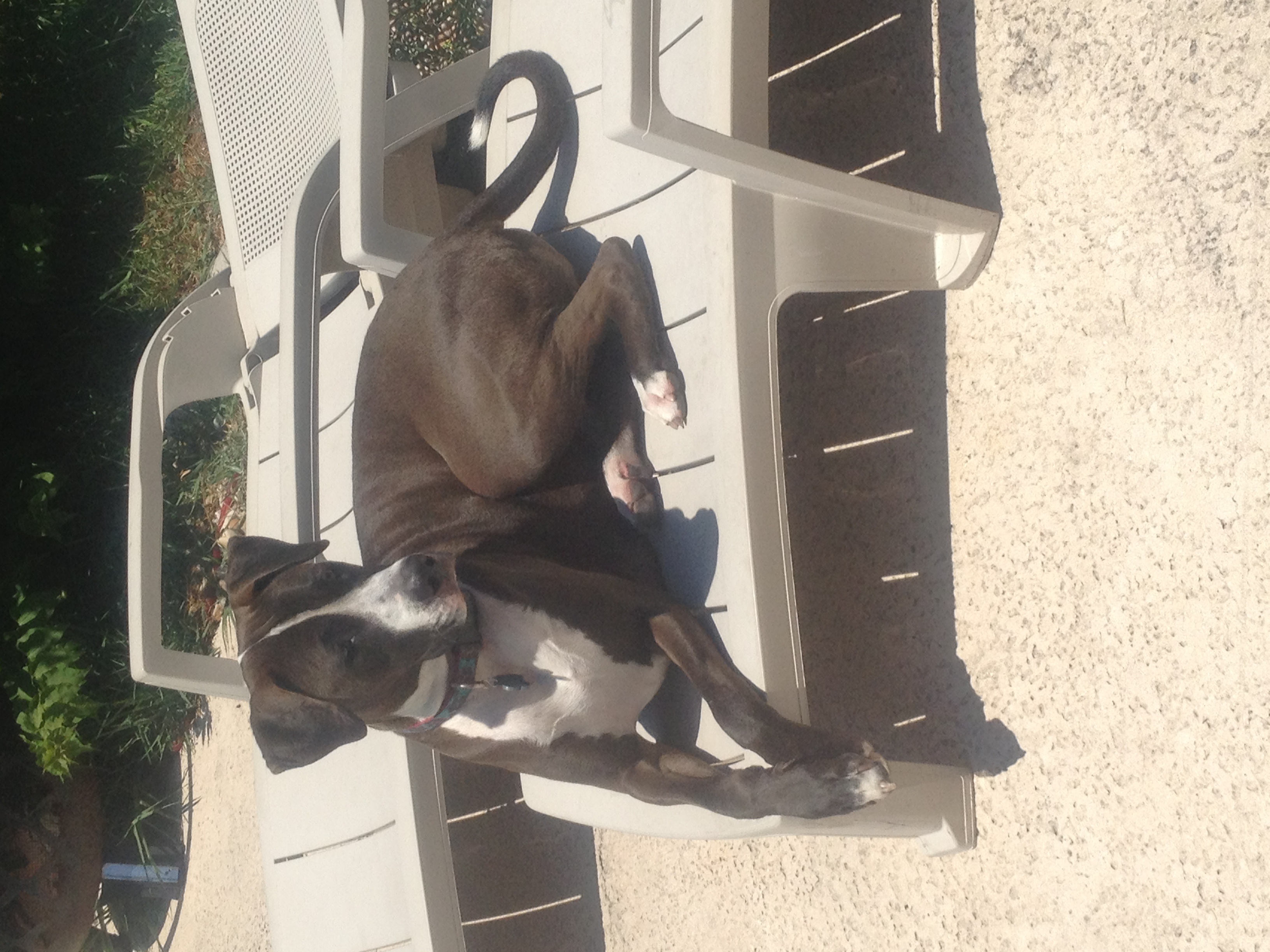 We adopted Knox at 8 weeks old from the SPCA. He only weighed 17 lbs. He now weighs 95 lbs and is 18 months old. He is super sweet, very smart, and lives for his time in the pool. We can't keep him out. His goofiest trait is his tail-it's curled into a loop! Where did that come from?? We love him so..
