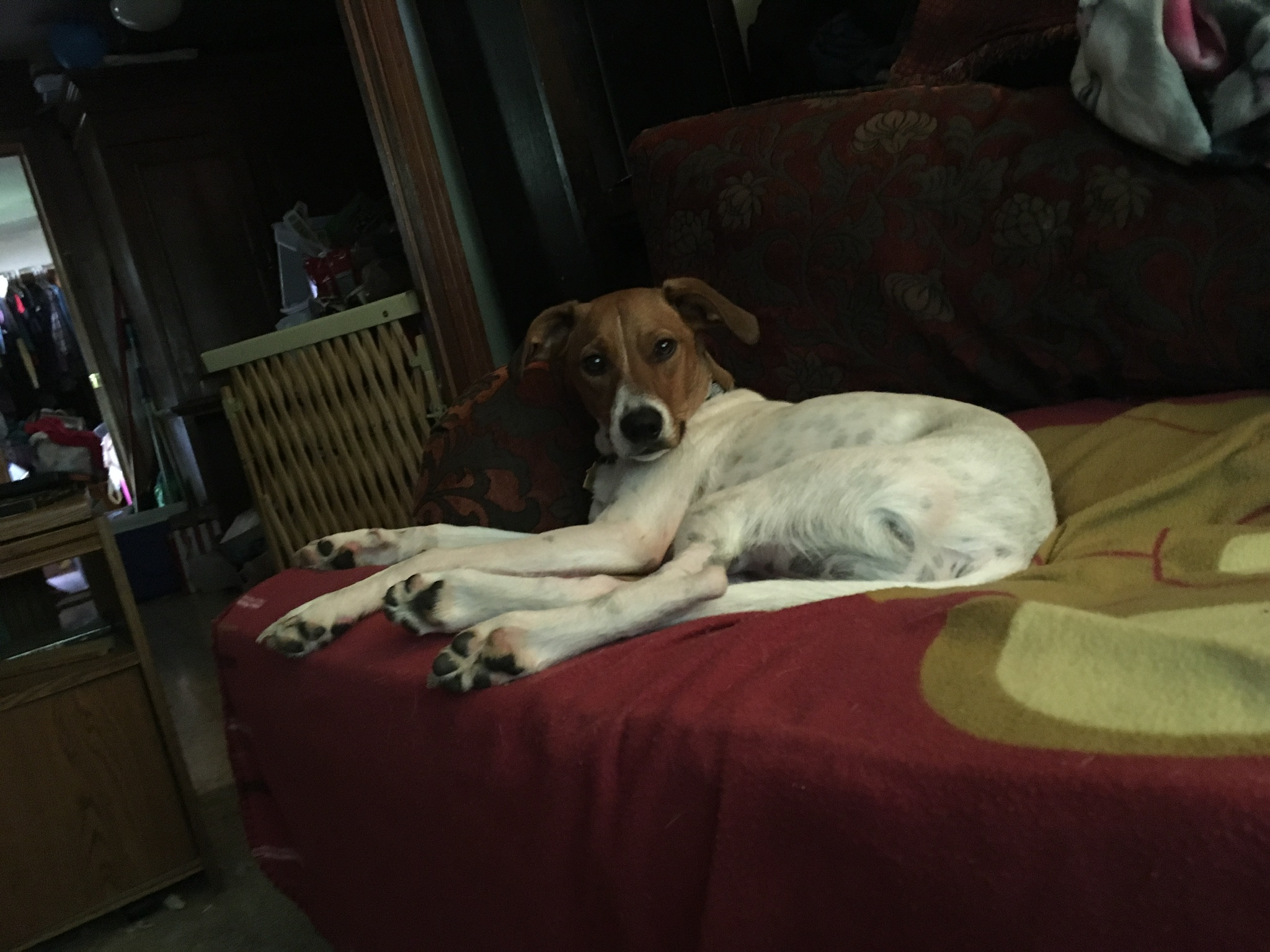 I see the Jack Russell in him, but have doubts about the lab mix. He’s very thin, and his structure resembles more Gray Hound or Whippet to us than a Labrador.