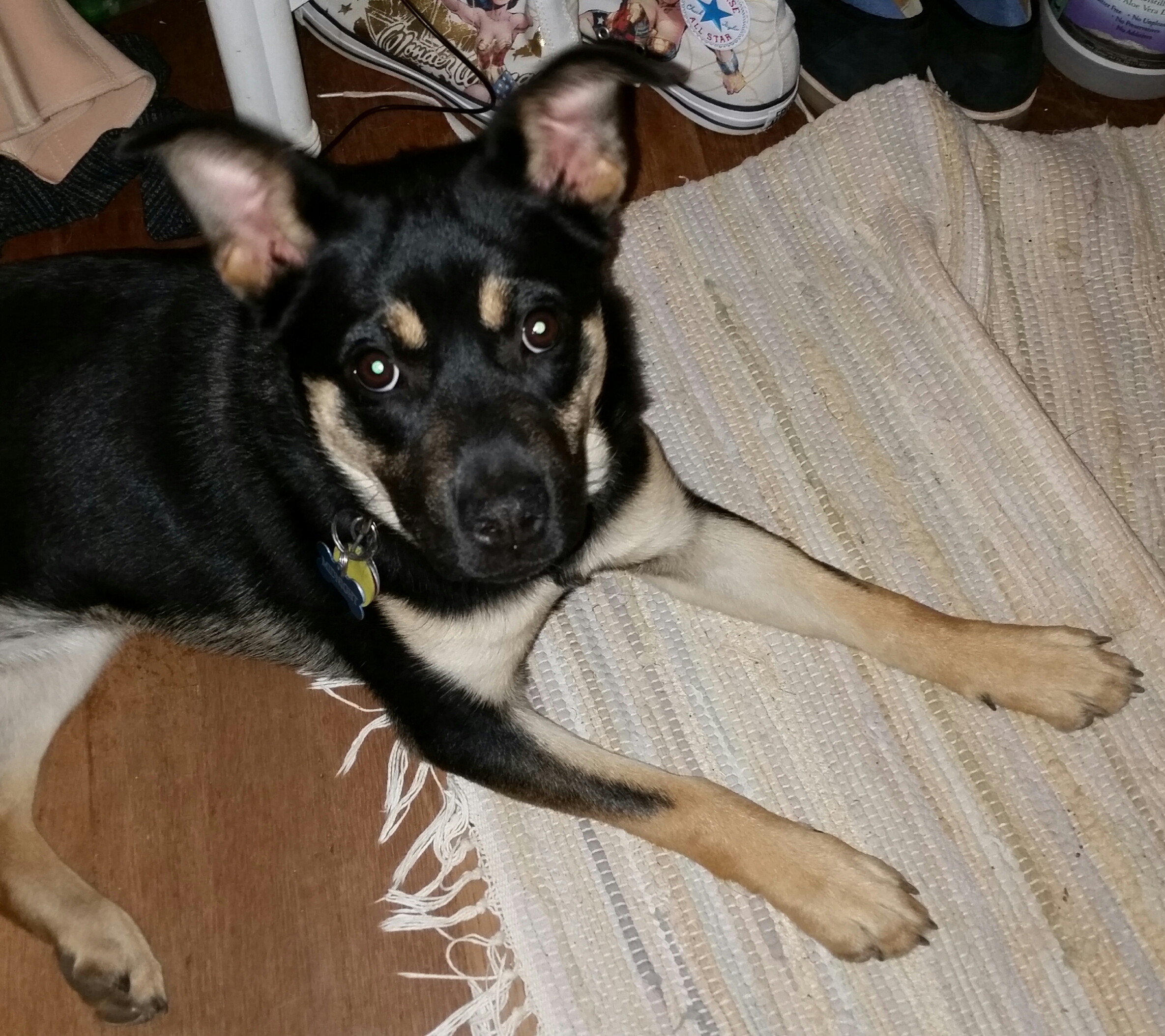 This is our six month old Midnight, who weighs just over 30 lbs. We adopted her from the Humane Society of Atlanta in March. The tag said Rottweiler/Lab mix but we thought it was more like a Rottie/German Shepherd mix. But now that we've had her for a while abs her growth seems to be too slow to believe she'll get much bigger.