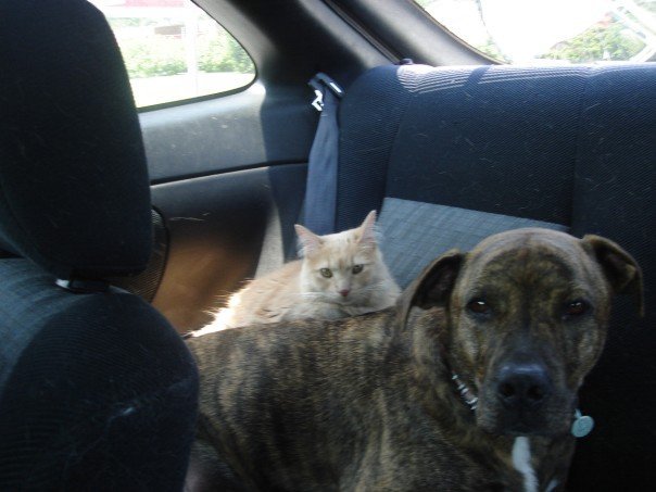 This is Muffin. I started taking care of her when she was a day old. Her mom was a stray my friend picked up. She looked like a red nosed Pit. 3 weeks after being picked up, she had 10 puppies, 8 were brindle with white markings, and two were white with brindle markings. Down the street from where Mama Dog was found, was a farm that had several Bull Mastiff dogs, so we're assuming she was visiting them. She is turning 7 on Jan 5, 2010. When I decided to keep her, I figured she would look ferocious so I gave her the sweetest name possible. Trust me, she lives up to her name. Pit bulls have a bad rap, but together we're slowly changing the minds of people who are uneducated on the breed.