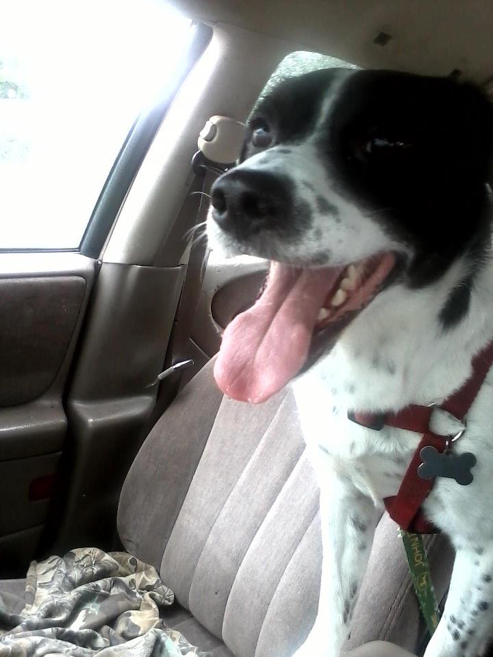 Muzzy is 3. Loves picking up shoes and socks and hiding them from people. Full of energy. Very Loveable. Black/White with spots. 45 pounds. Was thinking pointer/beagle mix?