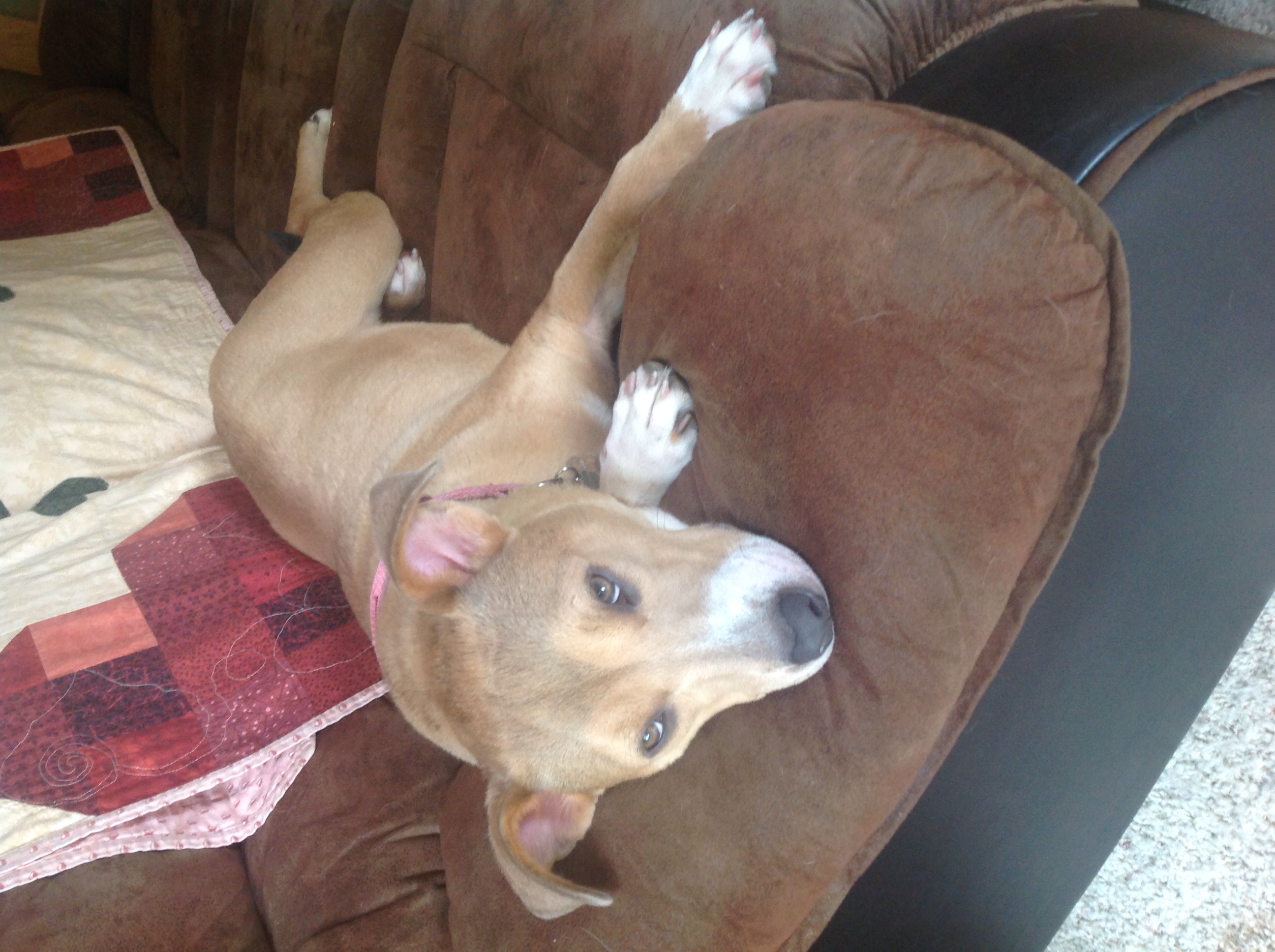 Patty was adopted from a shelter. She is under a year old, probably between 6-11 months. She has lots of energy but once she has been exercised she is down for the count. She loves to play with her toys. She is good with our other dog, but can over play with him a little too much which annoys him. She is not a fan of our cat and vice versa. We would love to know what breed she is. You can definitely see the pit in her , but she is as soft as a cotton ball, so there is something else too. She weighs 40 lbs.