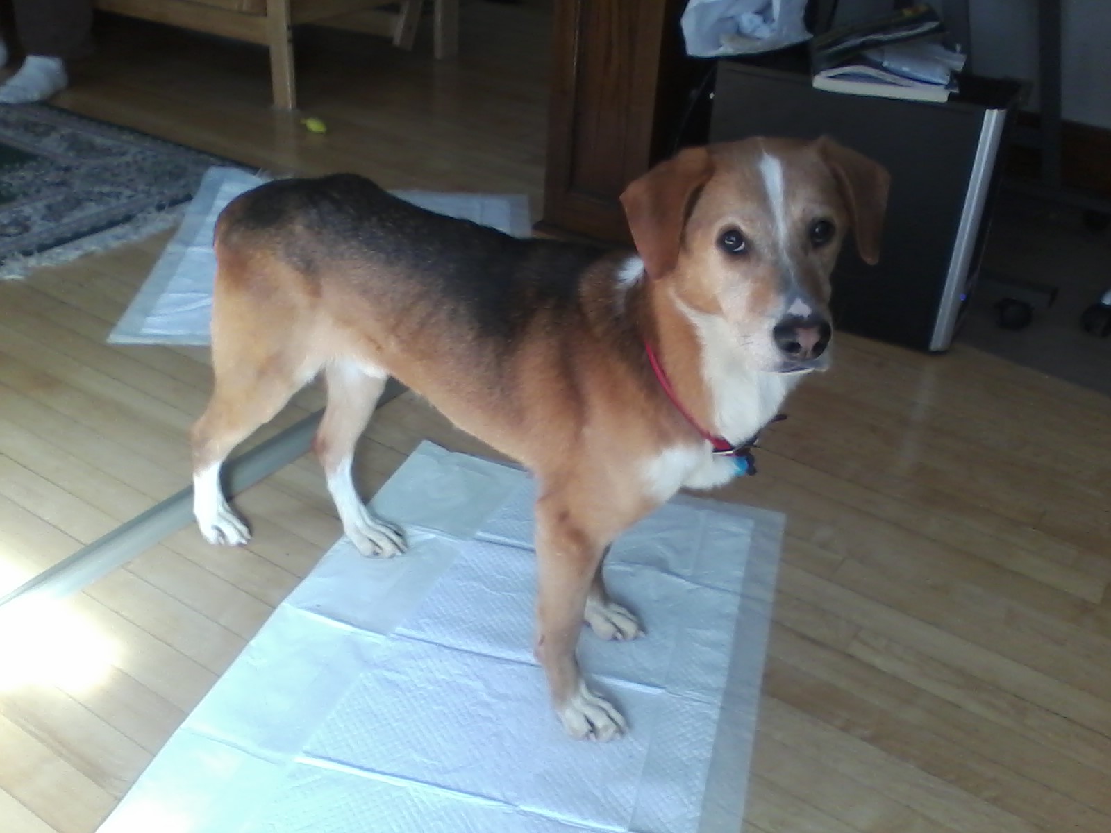 Remington is a rescue dog. He was found about a week ago, had no identification, so I took him in. He is extremely affectionate, but shy towards new people and about 10 pounds underweight. He LOVES going for walks! He is about 20 inches tall at the shoulder, guessing about 2 years old.