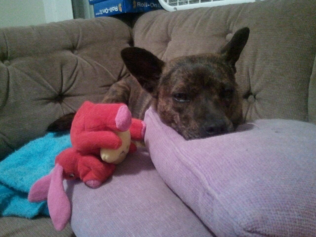 Here is my Roo relaxing on the couch with her favorite toy. She is 3-4 years old and about 30 pounds. I adopted her from the Cleveland APL a year and a half ago, best decision I ever made!