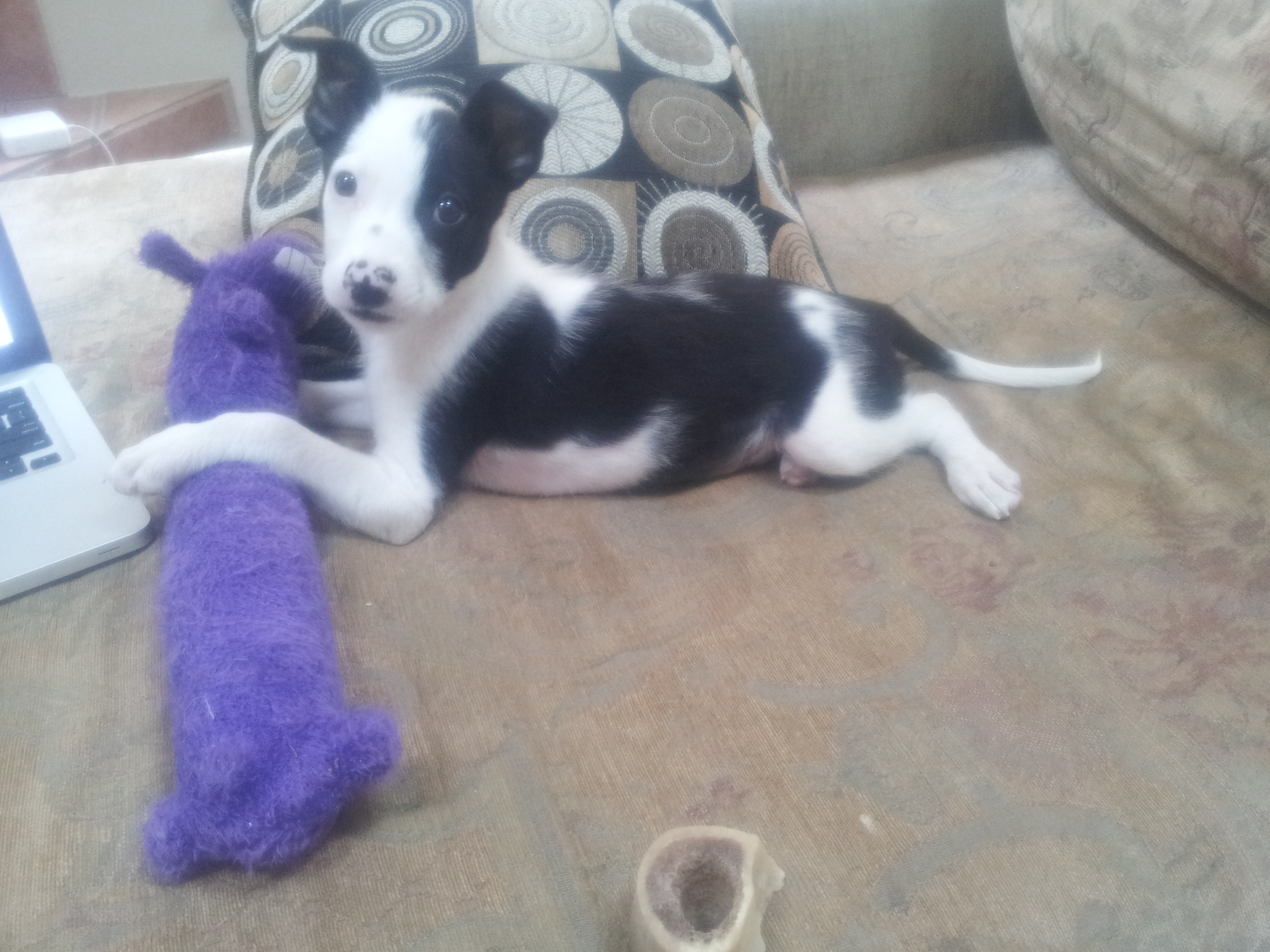 My little Tater tot at about 13 weeks. He's a rescue, so we don't know much about him. We're gonna do a doggy DNA test, but no idea what he is yet!